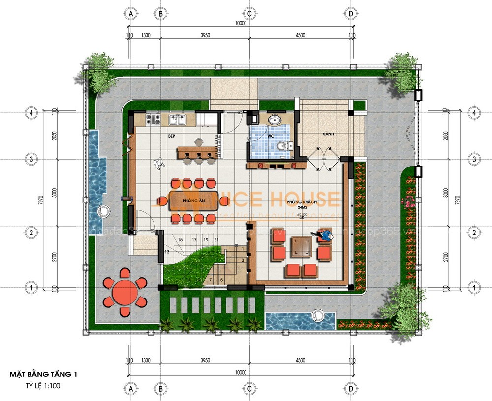 -Tầng 1: Tầng 1 bao gồm khoảng không gian dạo xung quanh nhà, sảnh, phòng khách và bếp ăn. Không gian đường dạo xung quanh nhà giúp thuận tiện giao thông và dành cho những ai muốn đi thăm quan, ngắm nhìn ngôi nhà từ nhiều phía. Từ sảnh đi vào chính là không gian phòng khách rộng rãi, sang trọng. vào trong là không gian bếp có 1 bar và khu vực bàn ăn dành cho 10 người. Khoảng lòng thang rộng nên các kiến trúc sư đã bố trí một không gian sân vườn nhỏ tạo tiểu cảnh cho ngôi không gian tầng 1.