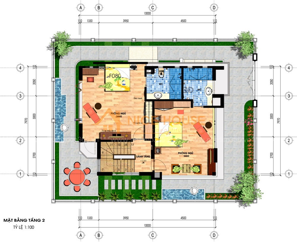 -Tầng 2: Là không gian dành cho 2 phòng ngủ lớn với vệ sinh riêng biệt.