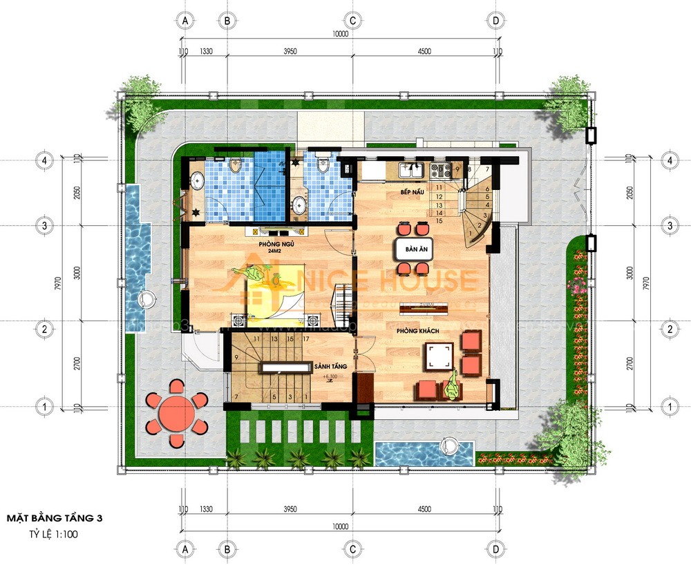 -Tầng 3: Gồm 1 phòng ngủ, phòng khách và bếp ăn nhỏ dành cho 4 người. Tùy theo tính chất công việc mà chủ nhà sử dụng không gian phòng khách và bếp phù hợp.