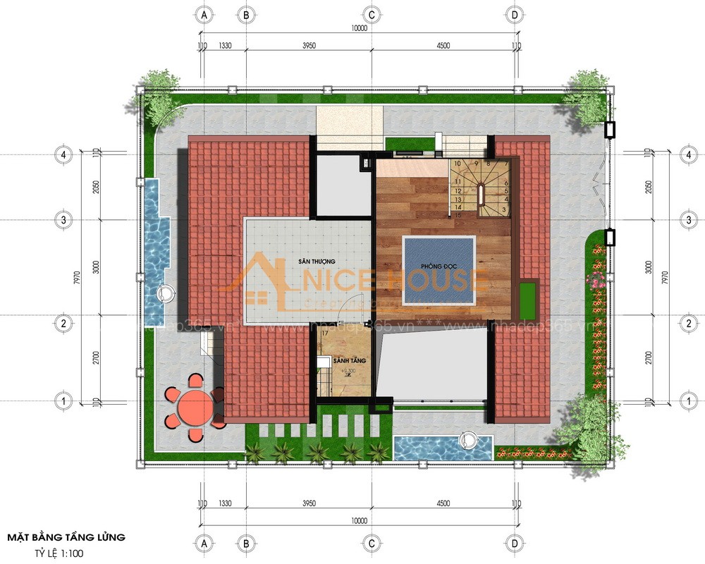 -Tầng thượng: Gồm sân thượng và phòng đọc.