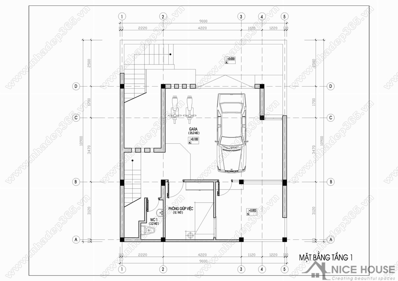 Ở thiết kế này, diện tích tầng 1 chủ yếu dùng làm gara để xe, phía cuối nhà có 2 phòng riêng dùng làm phòng cho người giúp việc và kho để đồ cho cả gia đình. Ngoài ra, kỹ sư không quên thiết kế một lối đi nhỏ bên nhà có thể để gia chủ trồng hoa hoặc làm lối đi lại, khu vui chơi của trẻ nhỏ… Hơn thế nữa, một nhà vệ sinh nhỏ phía cuối nhà cũng rất có ích đó nha.