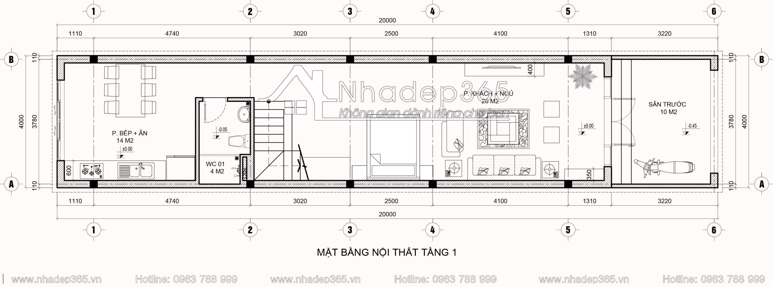 Tầng 1: Phòng khách + ngủ, phòng bếp + ăn, vệ sinh chung, sân trước