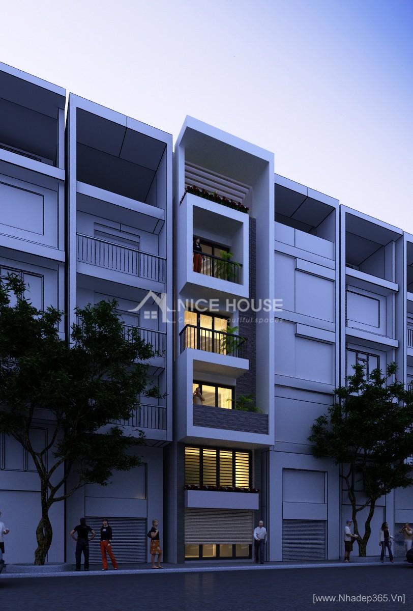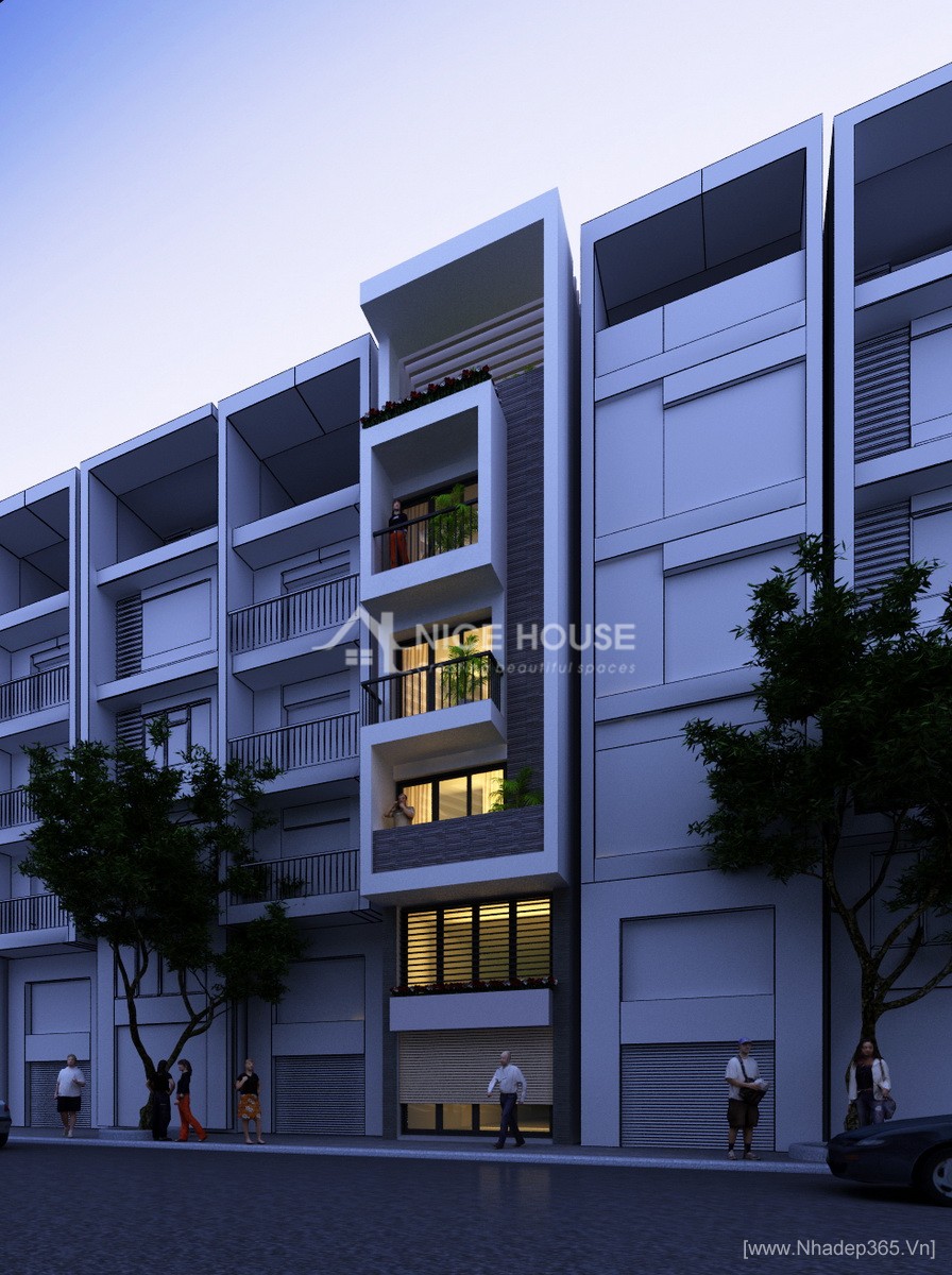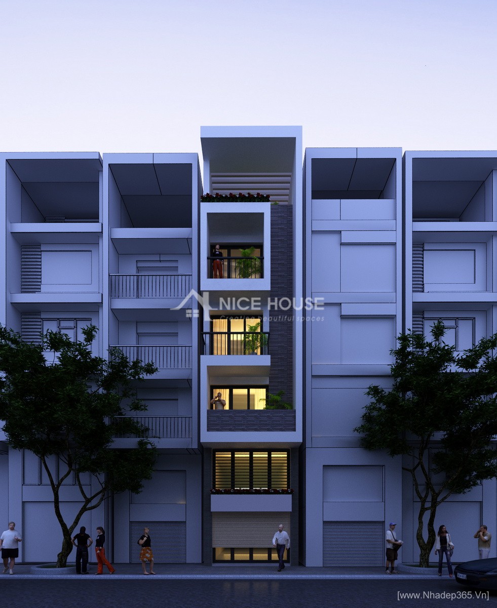 Nhìn những hình ảnh phối cảnh của ngôi nhà ở dưới ta có thể thấy ngôi nhà có 4 tầng, trong đó có 3 tầng có lan can với nhiều cây xanh và các ô kính trong suốt. Mặt tiền của công trình nổi bật với những đường nét khỏe khoắn, dứt khoát bởi các hình khối, đường nét rõ ràng. Màu ghi tối nổi bật trên tông màu trắng chủ đạo toát lên sự tinh tế, hiện đại của ngôi nhà. Việc lắp đặt các cửa kính ở mặt tiền của công trình giúp cho người xem không cảm thấy nặng nề, ngột ngạt mà thay vào đó là cảm giác thông thoáng, hiện đại.