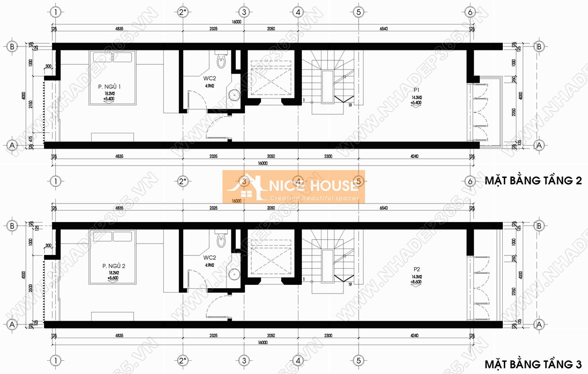 Tầng 2 và tầng 3 của công trình được thiết kế khá giống với mặt bằng tầng lửng. Do ngôi nhà có chiều dài khá lớn nên việc bố trí, thiết kế các bộ phân theo nó là một điều rất hợp lý. Mỗi tầng đều có một phòng ngủ, một nhà vệ sinh bên cạnh sảnh thang và một phòng tự do khác. Về cơ bản, các tầng đều được chia ra 3 phần khá đều nhau.