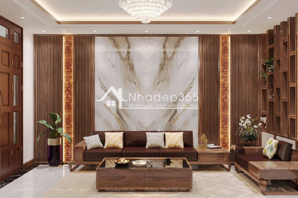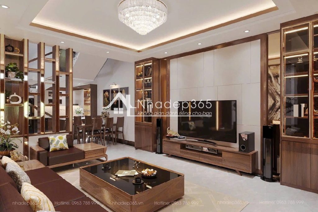 Mẫu thiết kế thi công phòng khách gỗ óc chó đẹp