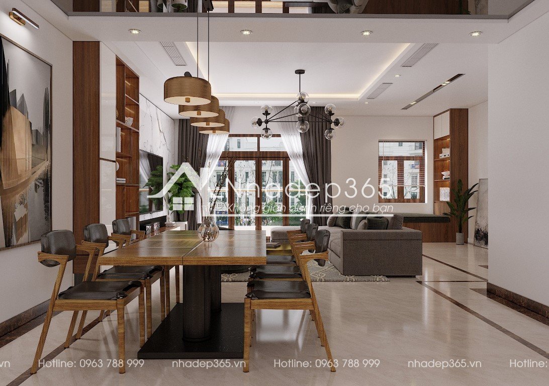 Để đáp ứng yêu cầu của gia chủ về không gian phòng khách và phòng bếp có tông màu ấm, sang trọng, thanh lịch, ưu tiên sử dụng nội thất gỗ mang phong cách hiện đại. Đội ngũ KTS nhadep365.vn lựa chọn phong cách thiết kế nội thất hiện đại với màu sắc chủ đạo là màu trắng kết hợp vân gỗ màu trầm.