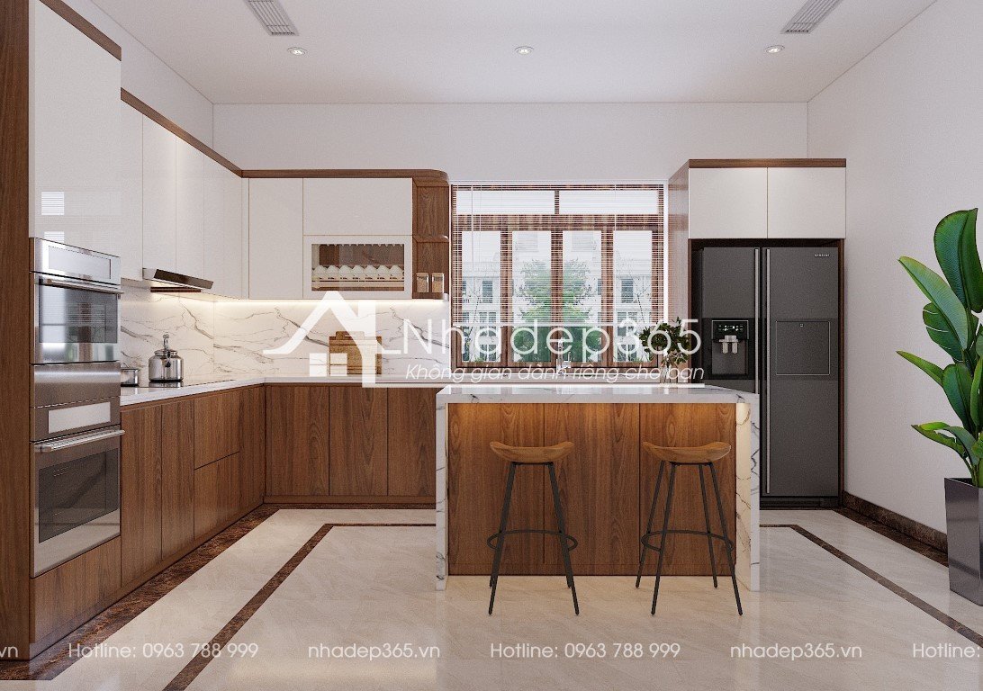 Khu vực bếp trong hình ảnh thể hiện một thiết kế hiện đại, tiện nghi và ấm cúng, hoàn hảo cho không gian sống của gia đình. Tủ bếp được làm từ gỗ tự nhiên với tông màu nâu và trắng, tạo cảm giác gần gũi và sang trọng. Bố cục bếp hình chữ L giúp tối ưu hóa không gian, với các thiết bị như bếp nấu và lò nướng được bố trí hợp lý, tạo thuận lợi cho quá trình nấu nướng.